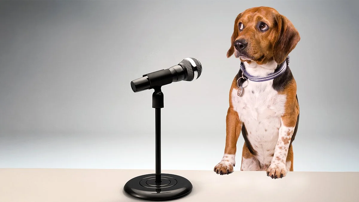 A puppy nervously approaching a microphone